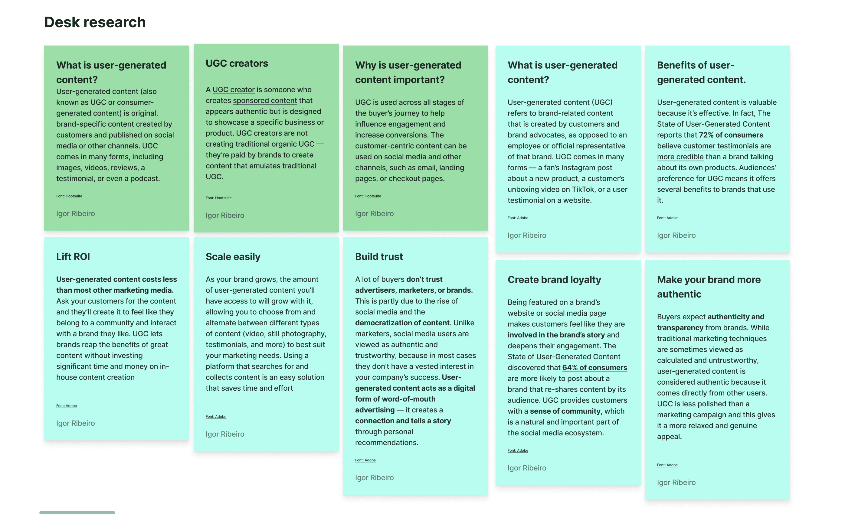 The desk research helped me find insights about the business's annual revenue, main benefits stats for brands that already use UGC and how the GenZ and Millennials behave in relation to UGC.